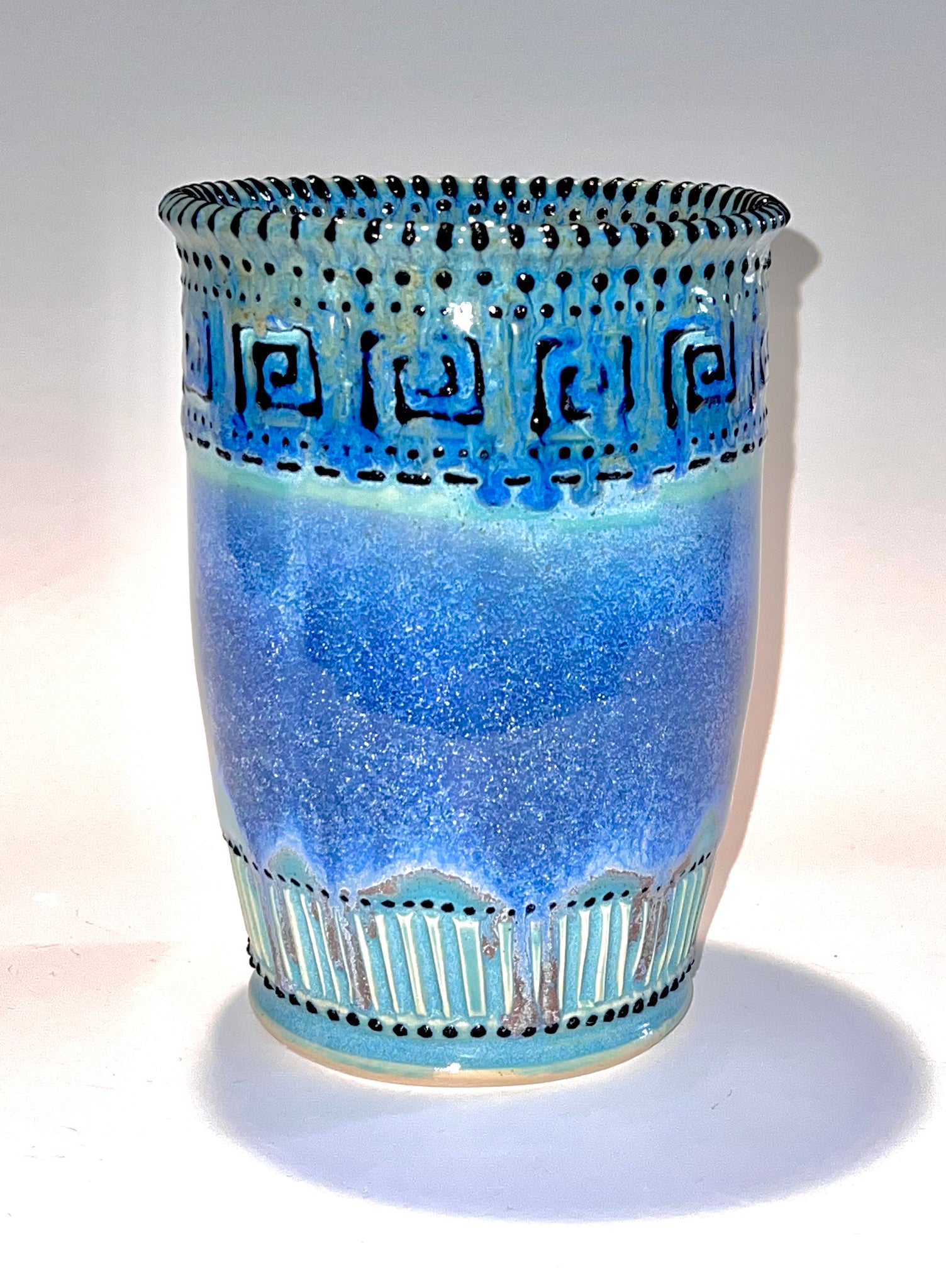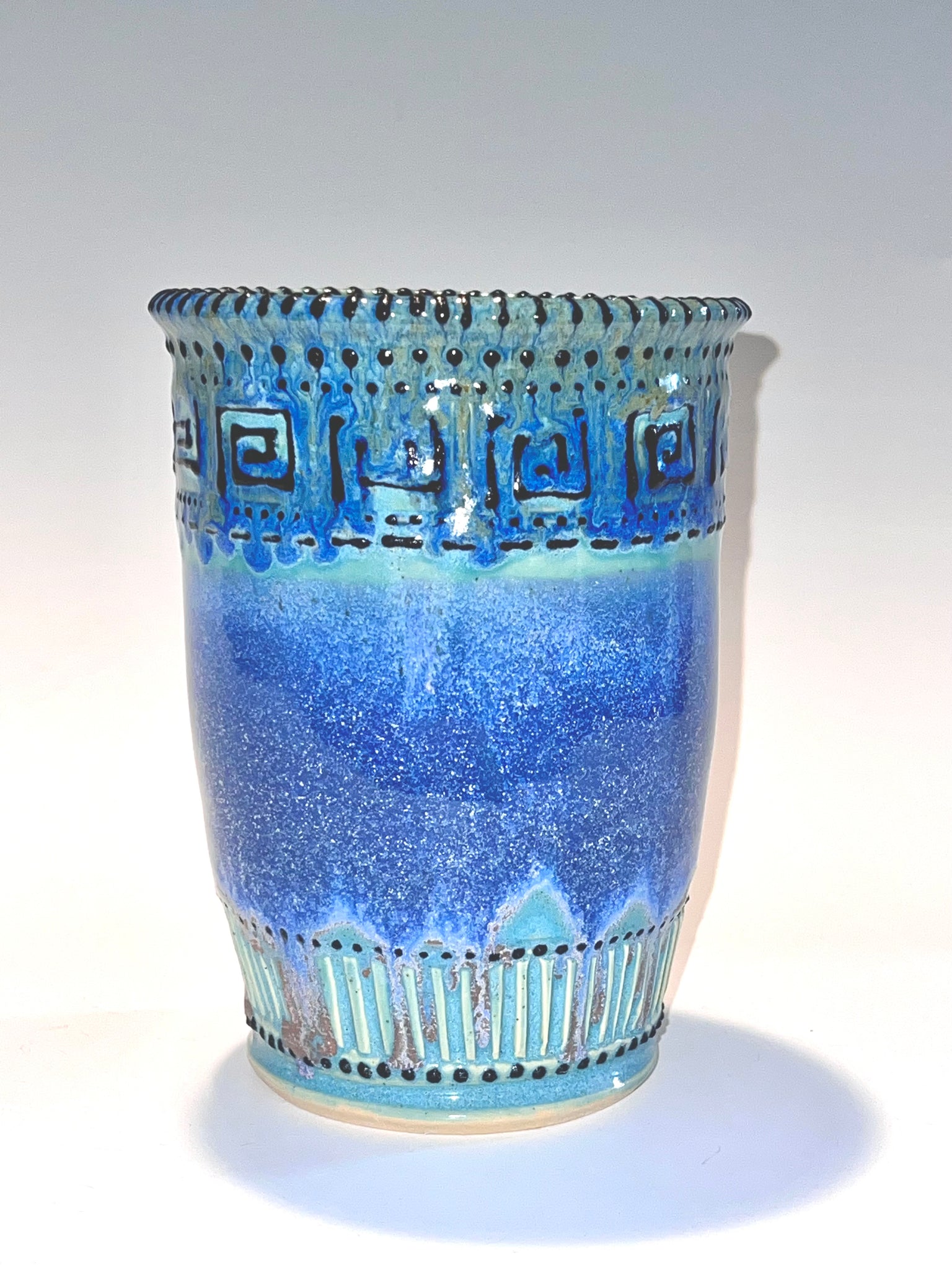 Wheel thrown with original slip trailing designs and a carved mandala bottom. Glazed and fired to grow sparkly blue micro-crystals in the glaze surface.