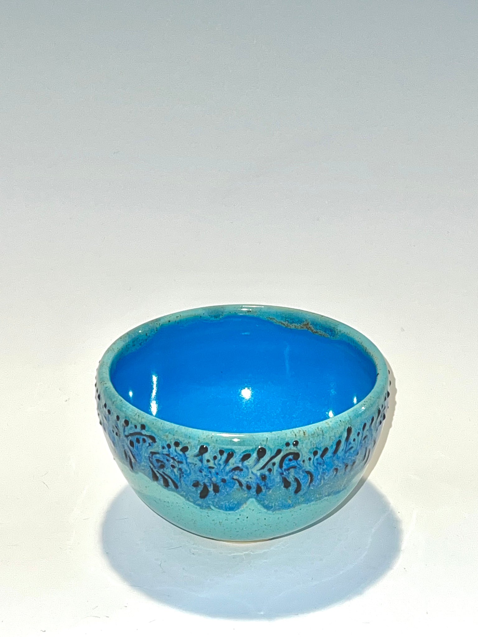 Wheel thrown and slip trailed bowl with an original carved mandala bottom.