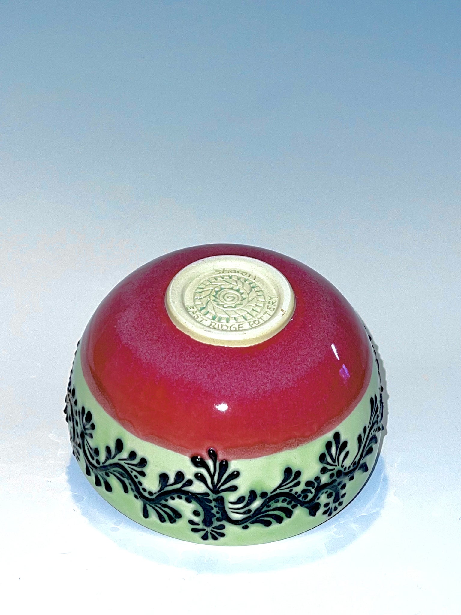 Wheel thrown and slip trailed bowl with an original carved mandala bottom.
