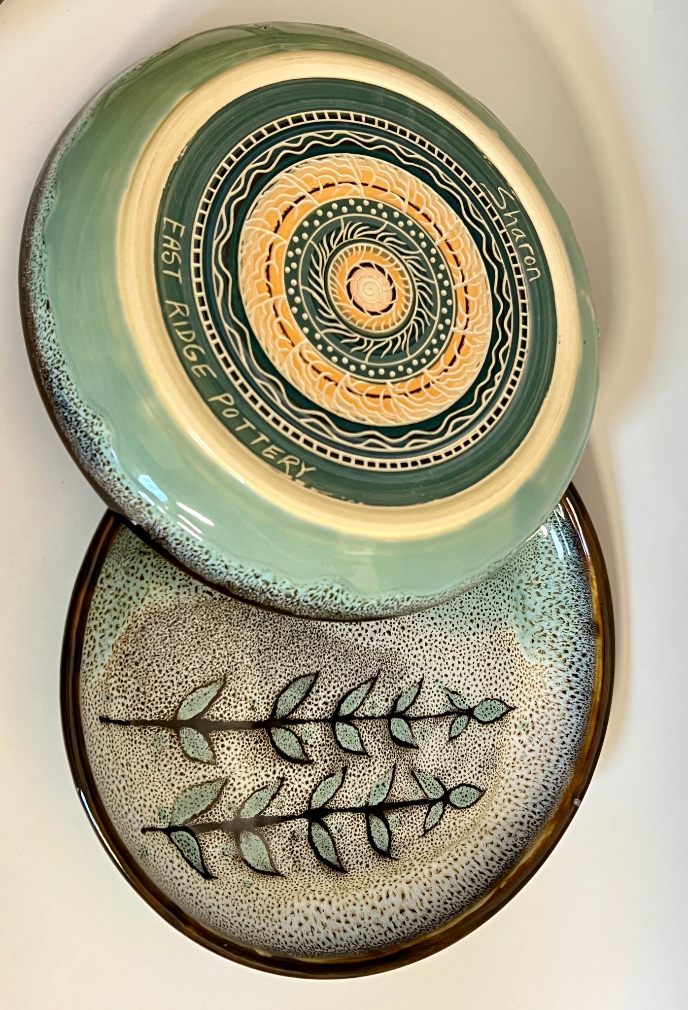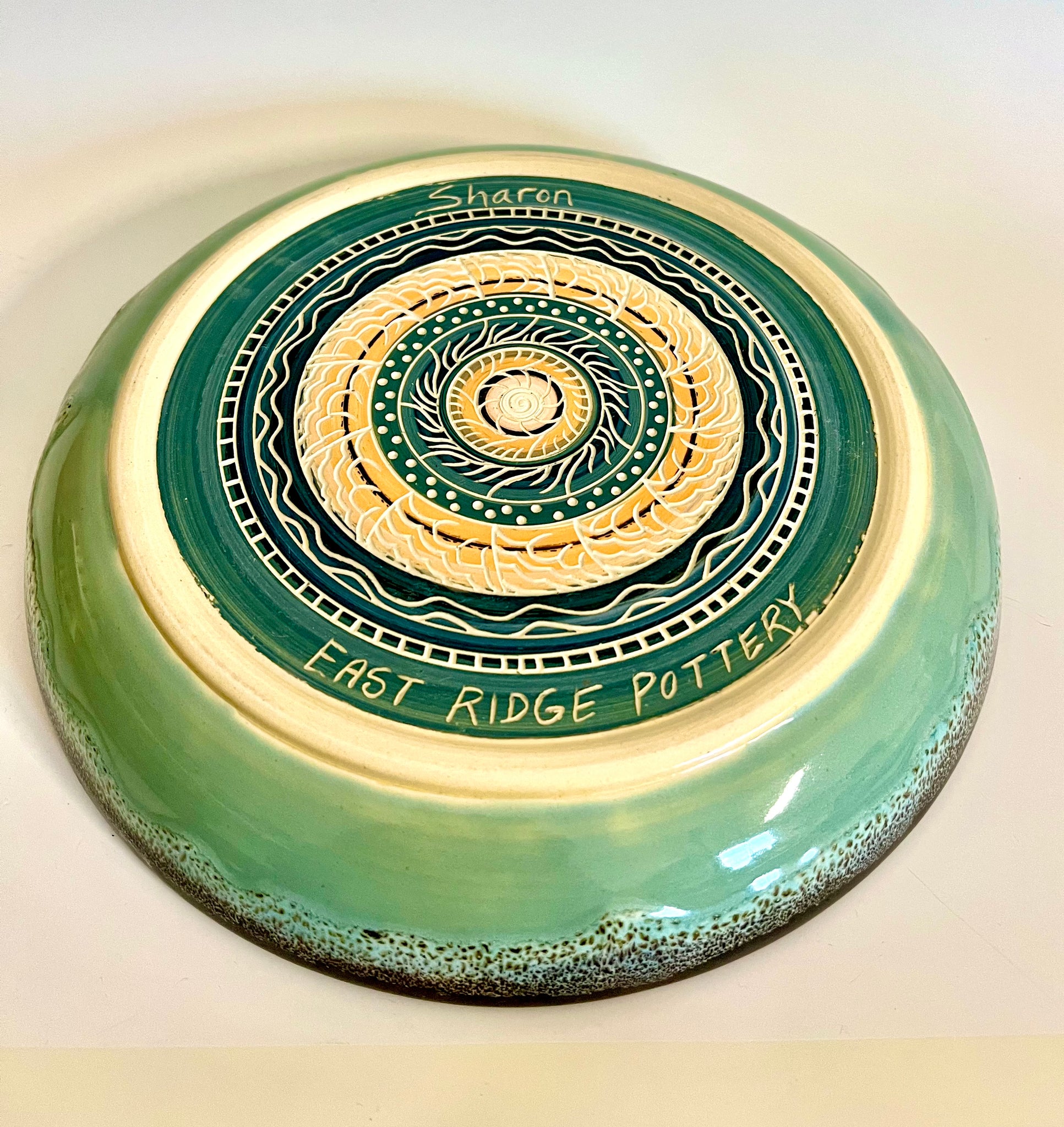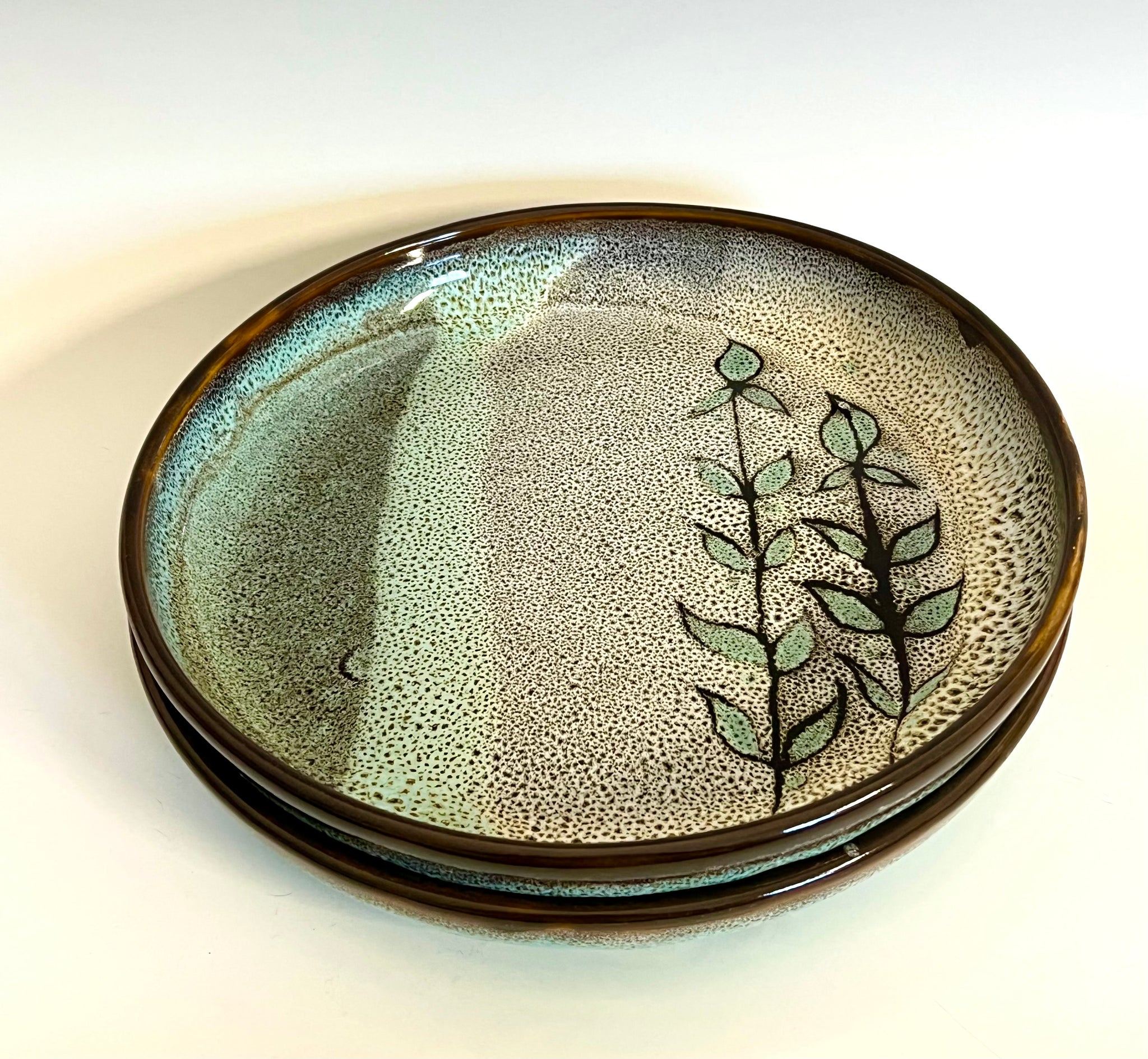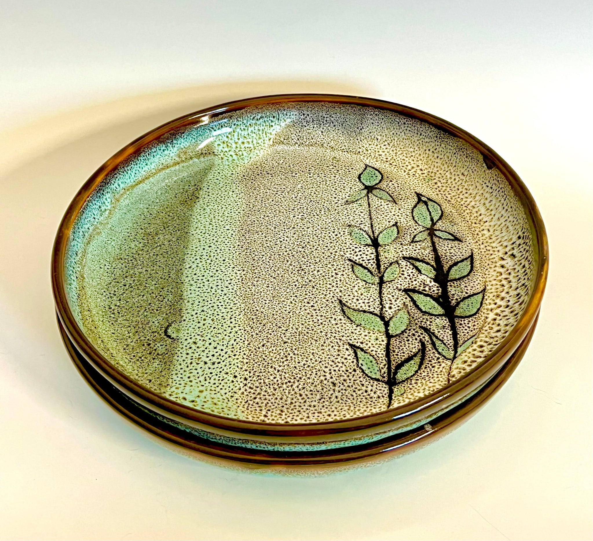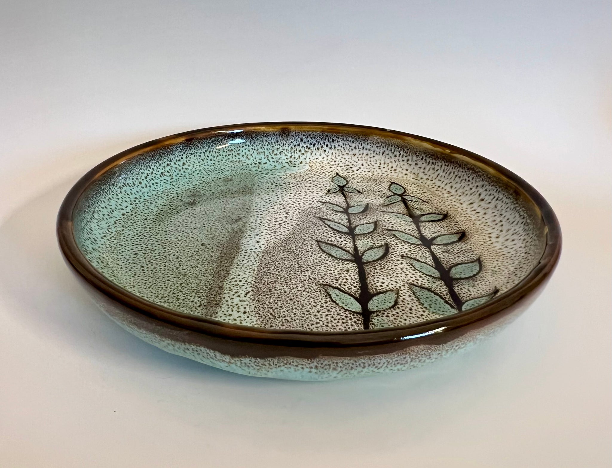 Wheel thrown plate with high sides. Glazed with original oil spot design and a unique carved mandala bottom.