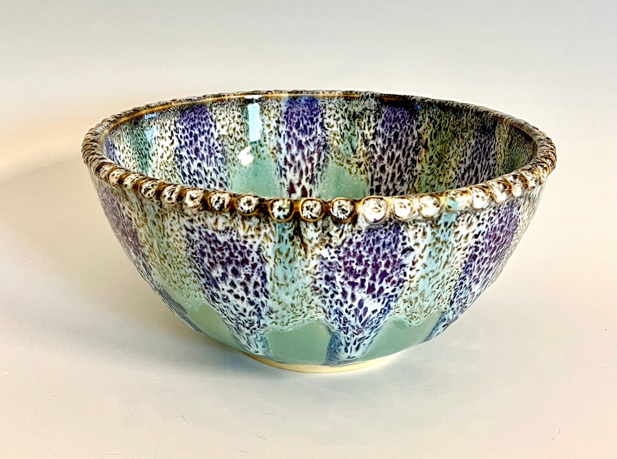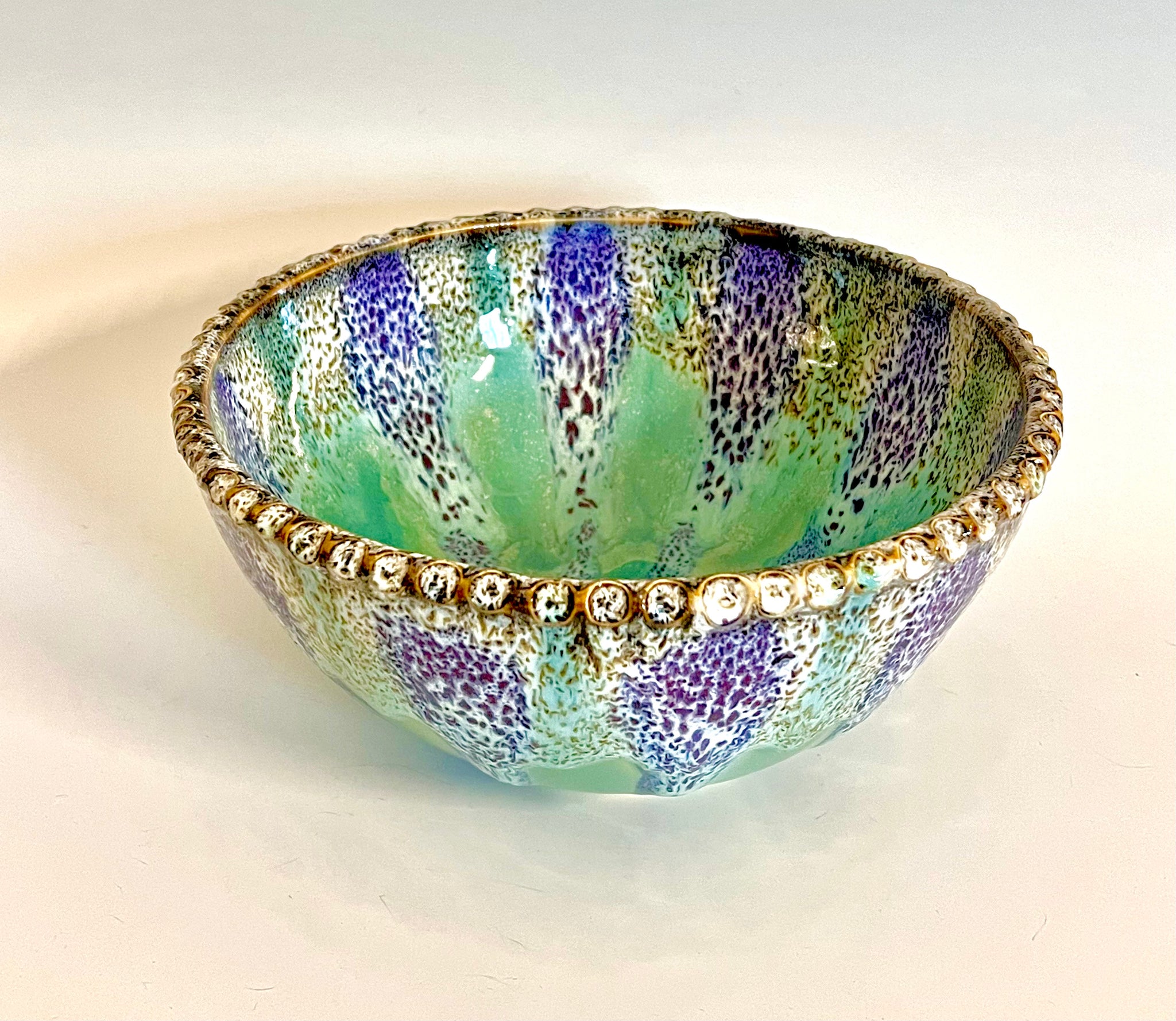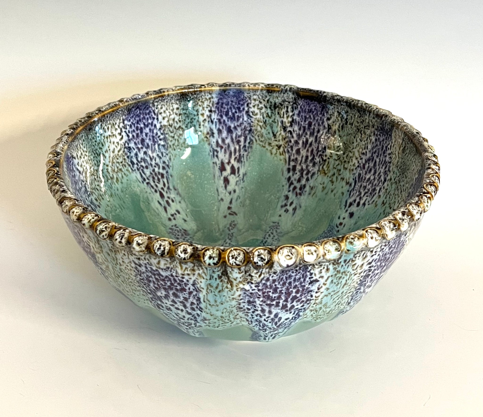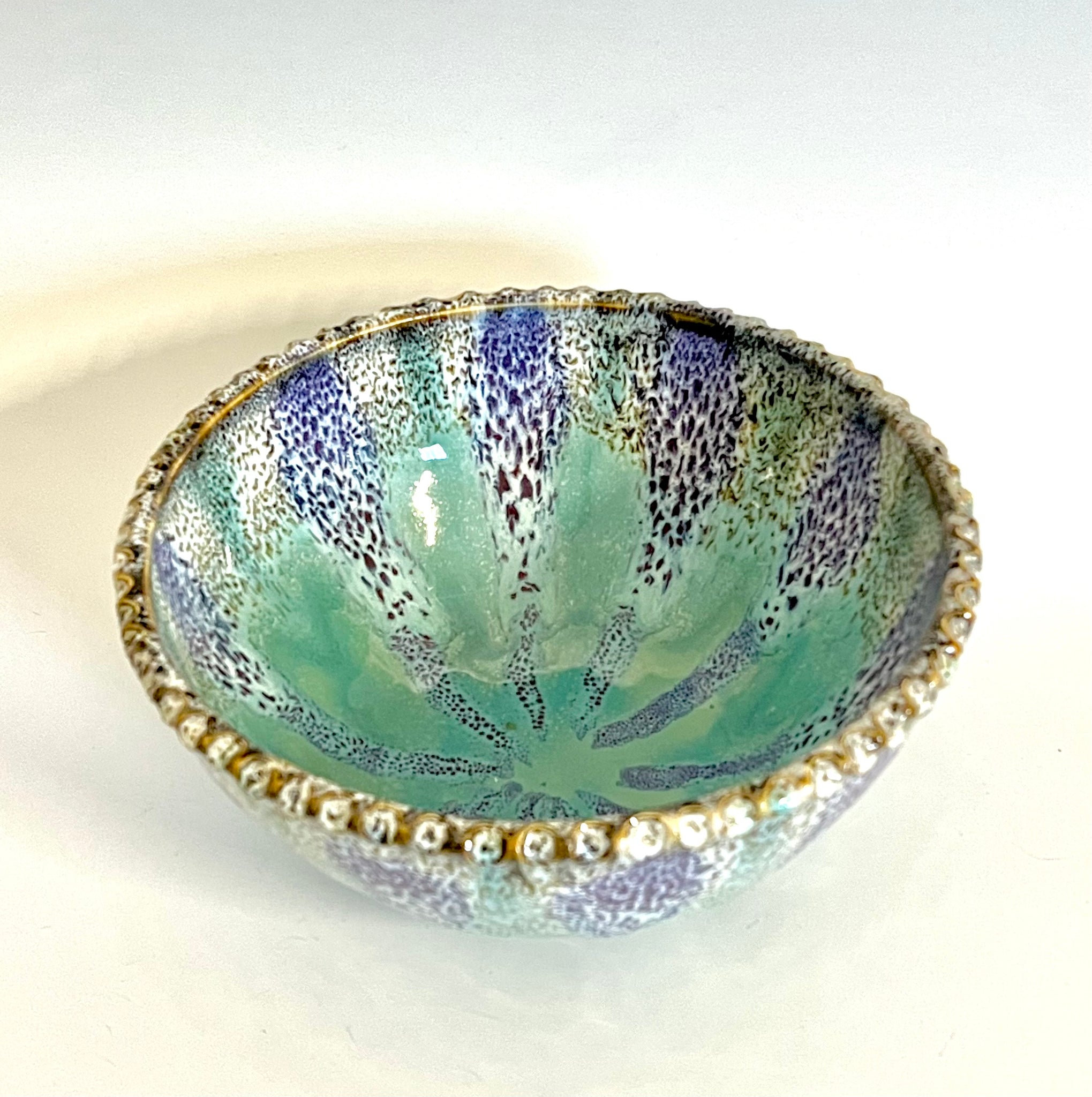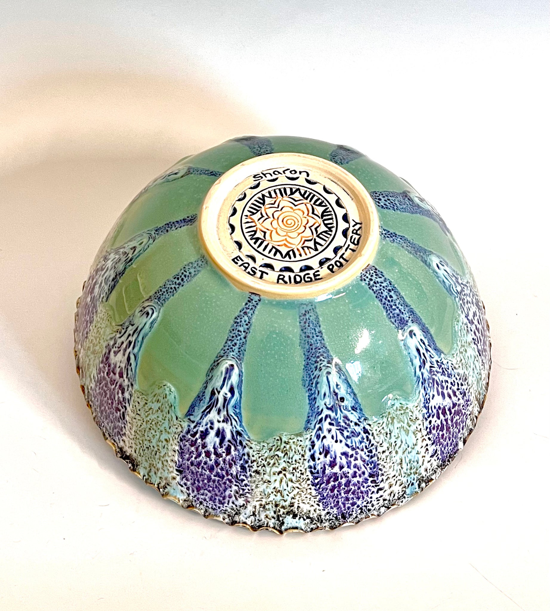 Wheel thrown bowl with a textured rim and an original carved mandala bottom. Glazed with an original oil spot design.