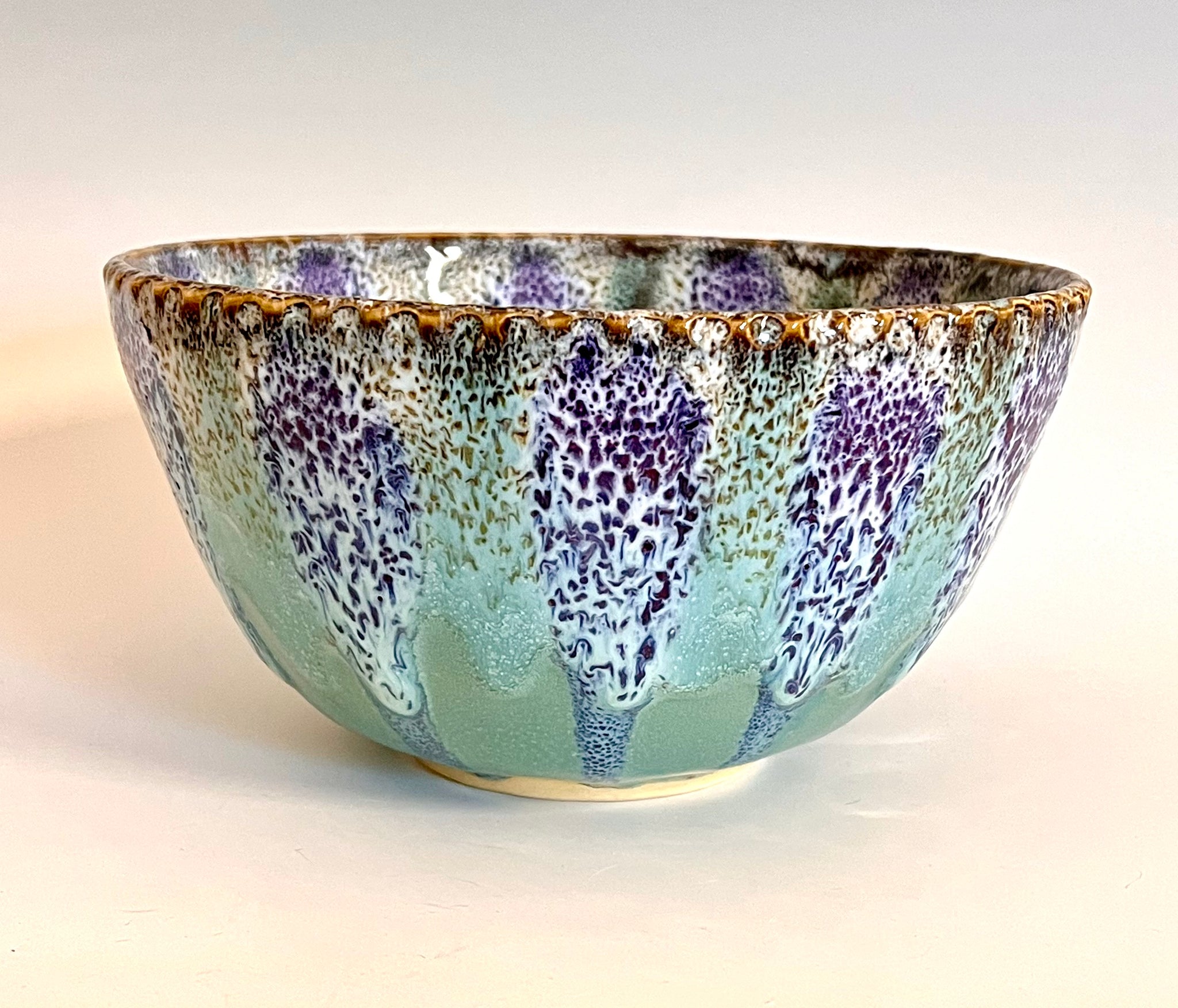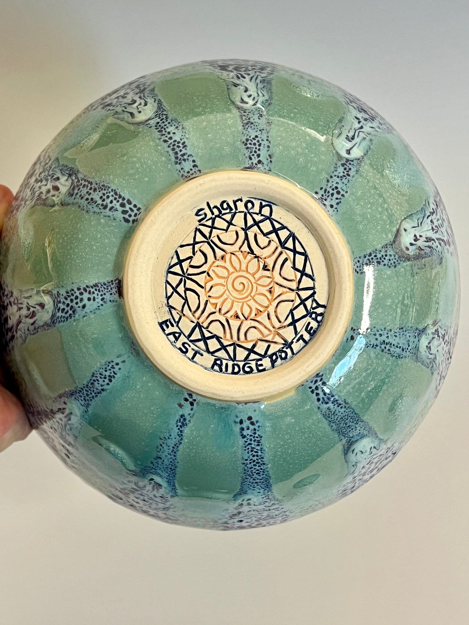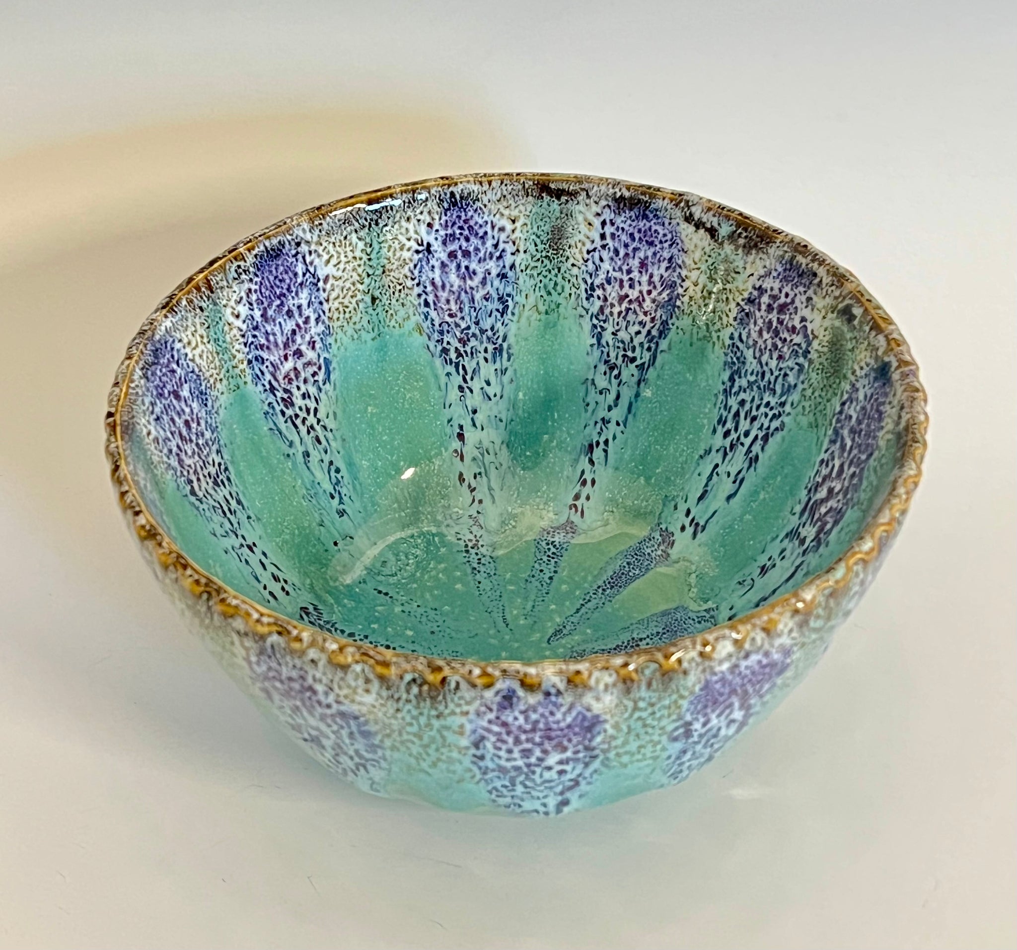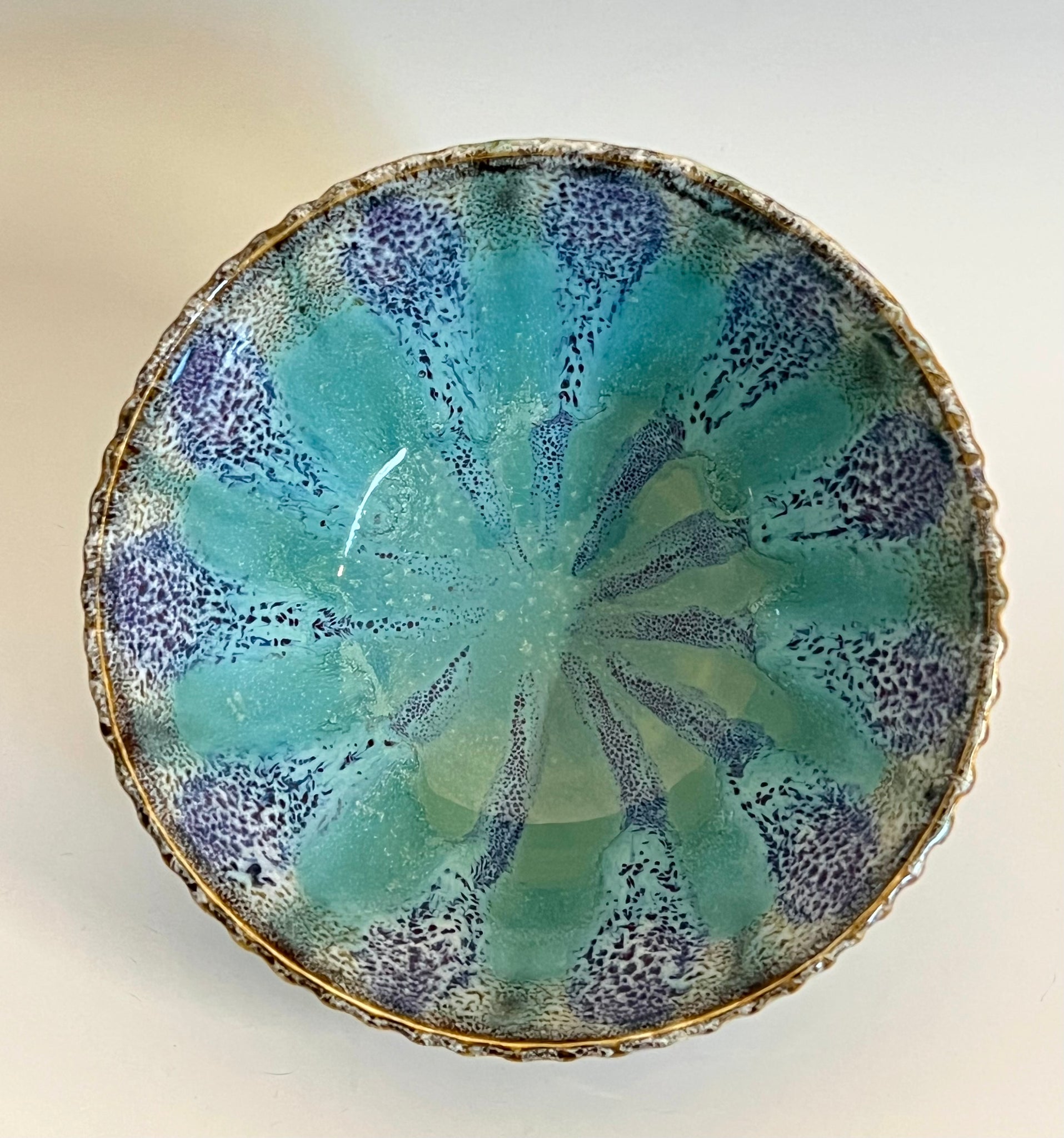 Wheel thrown bowl with a textured rim and an original carved mandala bottom. Glazed with an original oil spot design.
