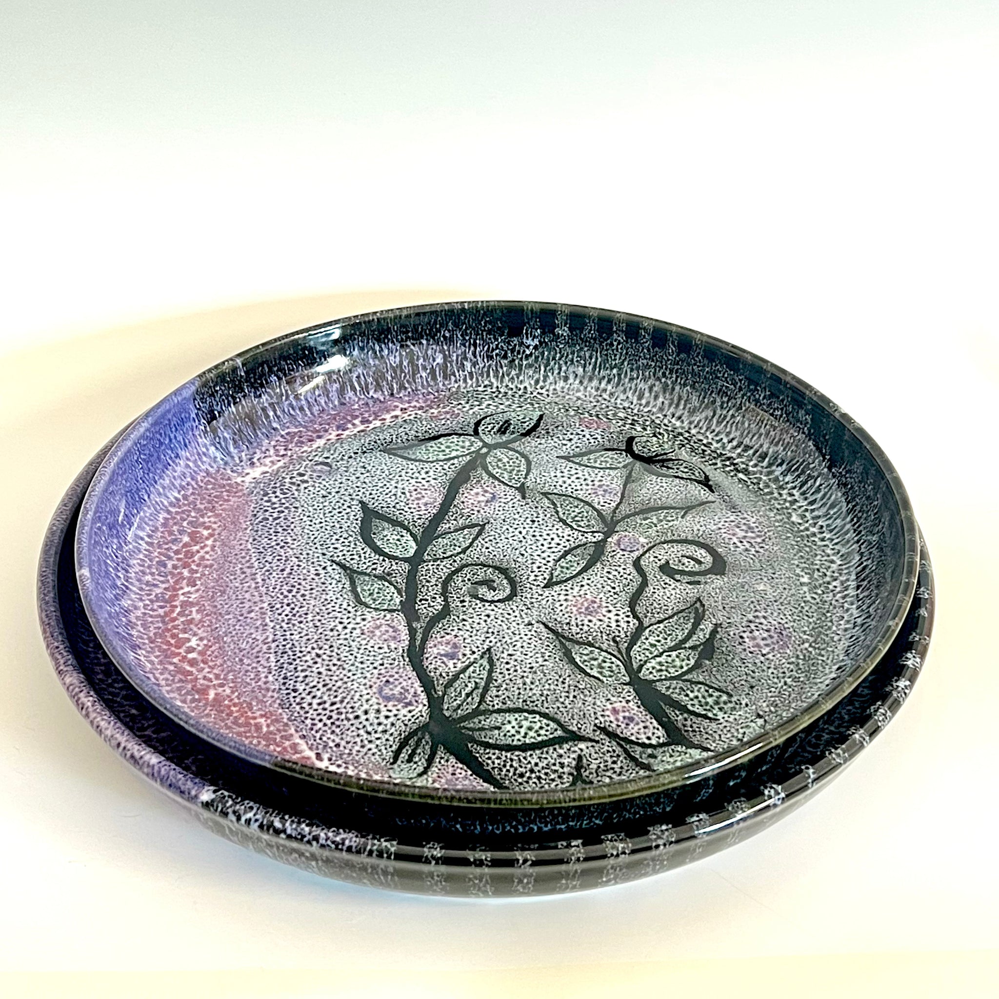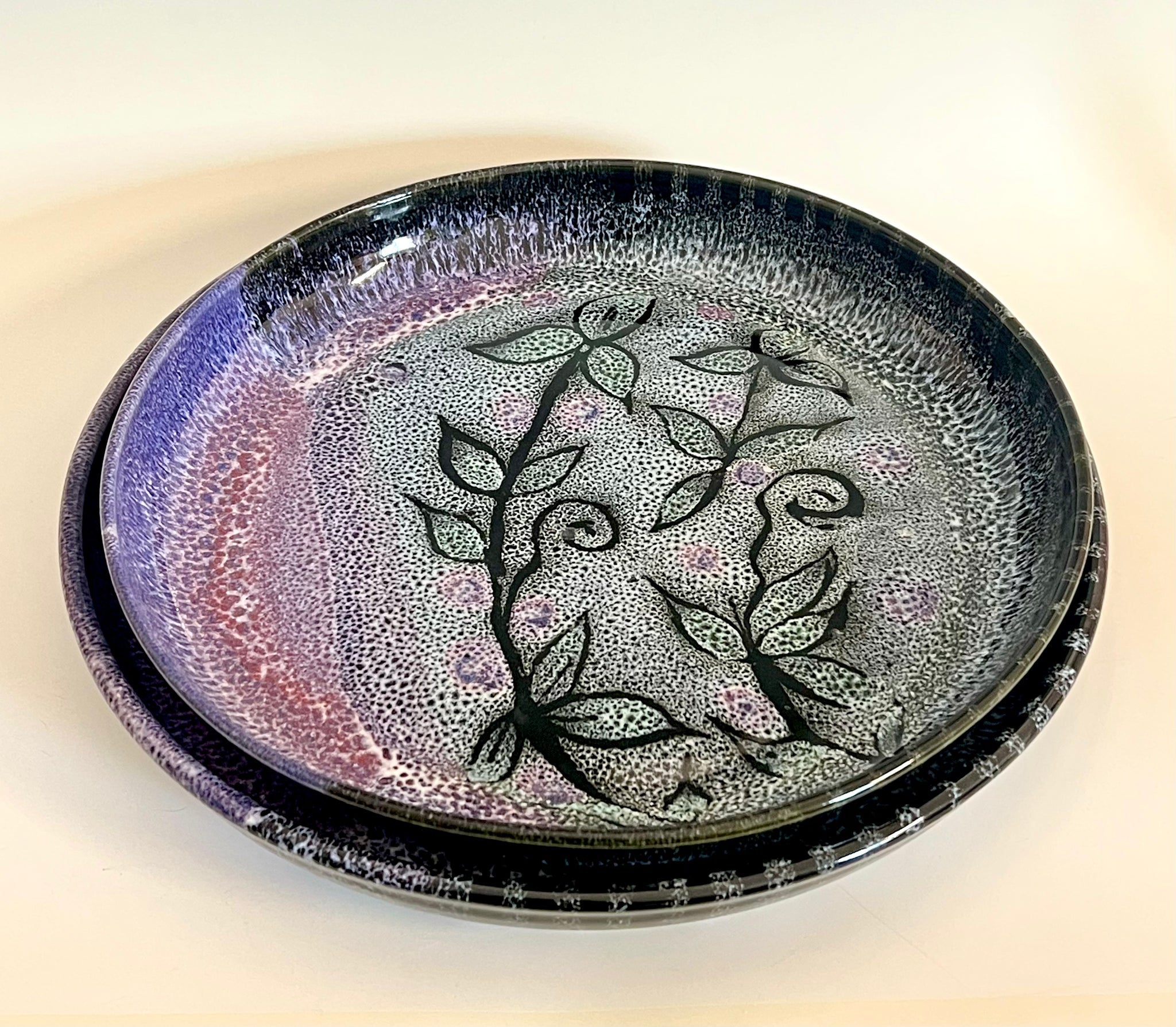 A combination bowl and plate so your gravy never escapes. Wheel thrown deep plates with an original carved mandala bottom and unique oil spot design glazes.