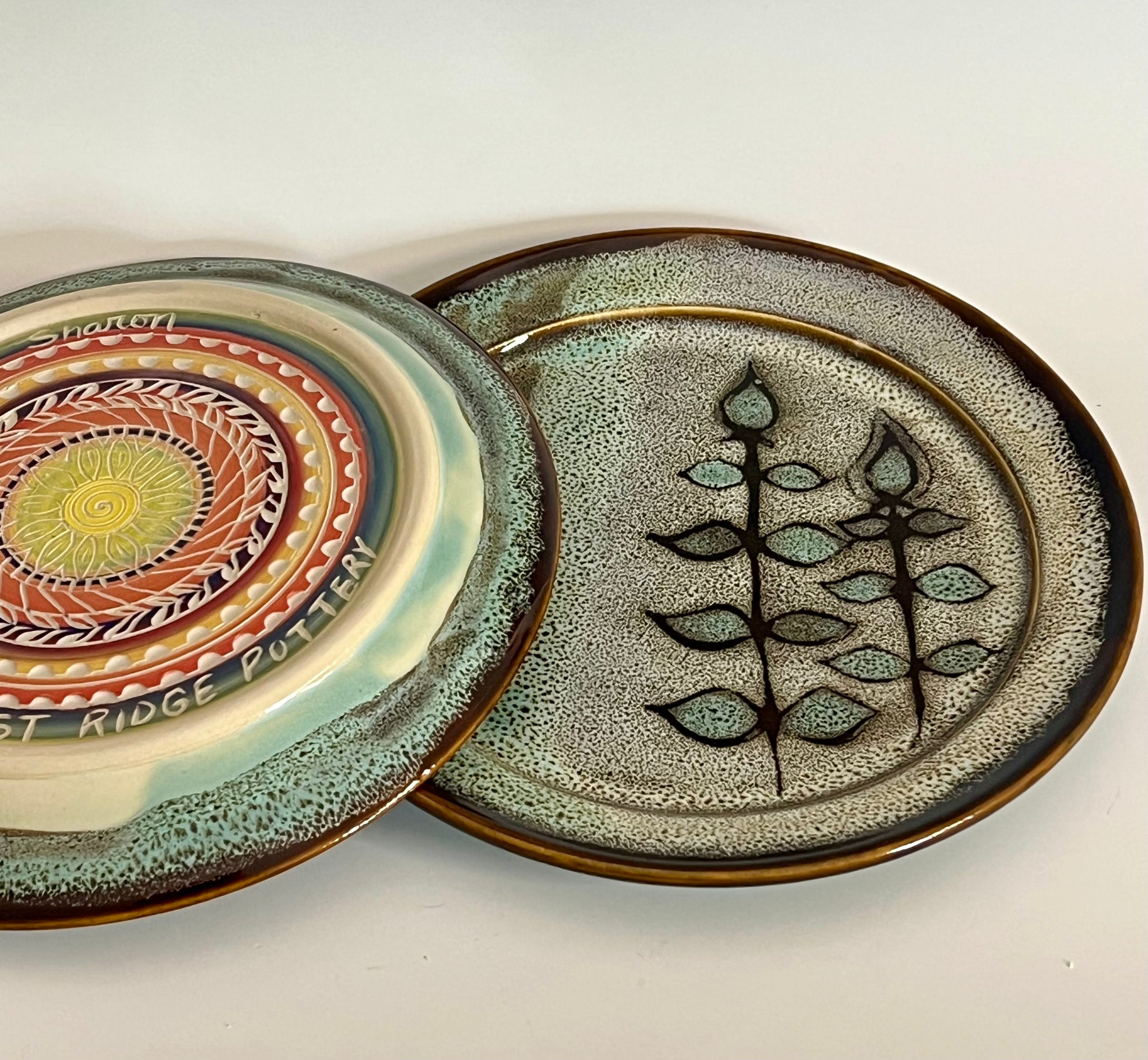 Wheel thrown with original carved mandala bottoms and unique oil spot glaze design.